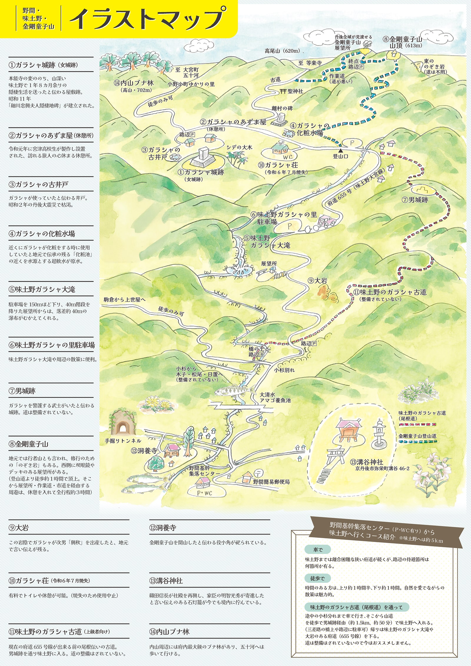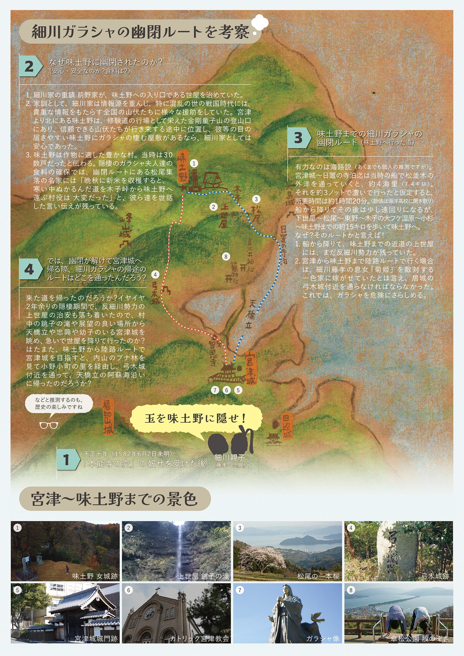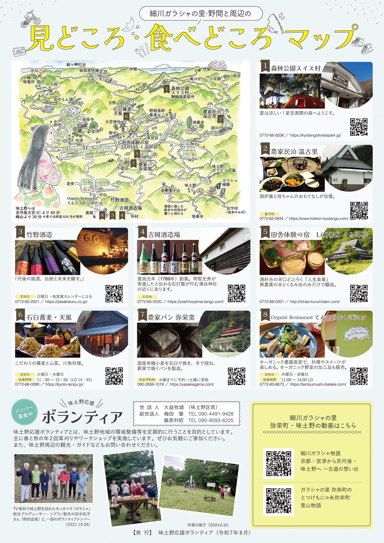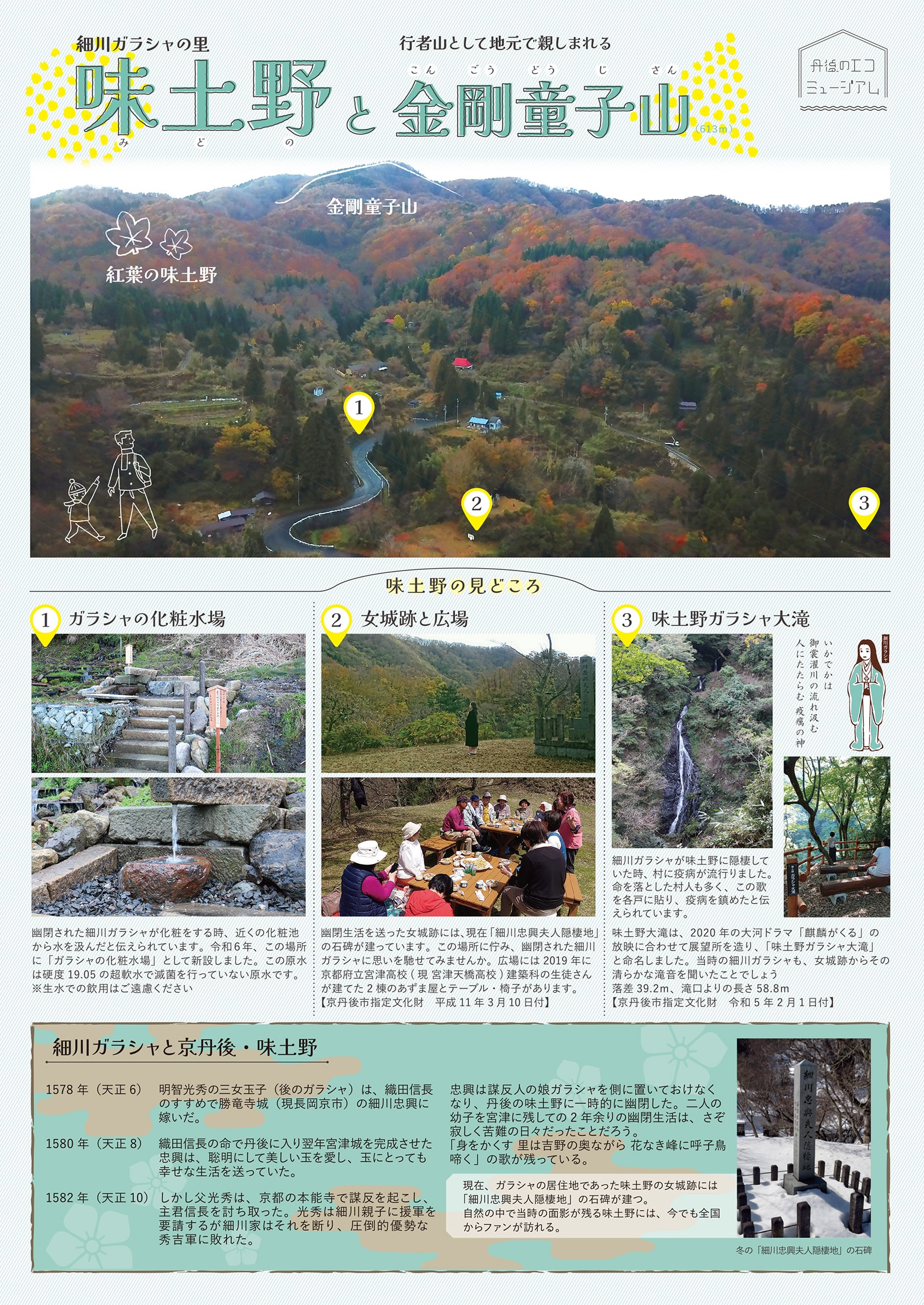 京都府京丹後市弥栄町の味土野や周辺地区について紹介したパンフレットです。味土野は、明智光秀の娘 玉(細川ガラシャ)の隠棲地であり自然豊かなところです。味土野のスポット、細川ガラシャの幽閉ルートを考察、見どころ食べどころ情報を掲載しています。発行:味土野応援ボランティア(令和7年8月)